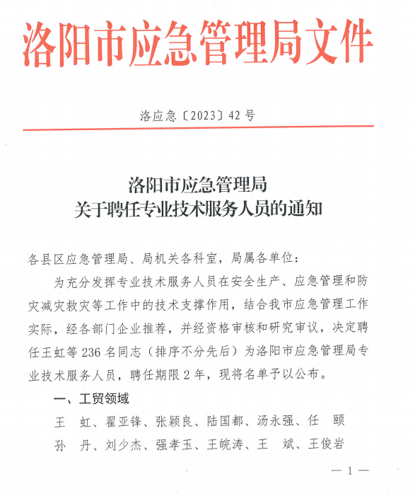喜報---- 河南省洛正藥業有限責任公司 兩名專業技術人員入選洛陽市應急管理局專家庫專家